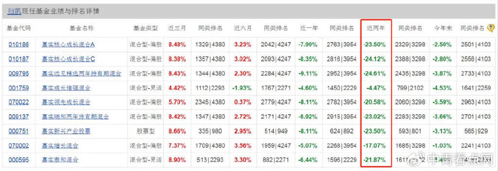 拉出基金经理来看,“明星”归凯现任基金资产总规模193.35亿元,看他现任基金业绩与排名,近两年业绩表现里,全是绿的。