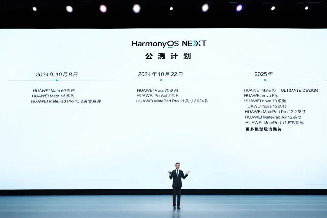10月22日起,纯血鸿蒙正式开启华为Pura 70系列、华为Pocket 2系列和华为MatePad Pro 11英寸2024款等机型公测。华为Mate XT非凡大师、华为nova flip、华为nova13系列等将陆续在2025年加入公测。