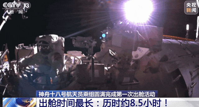 刷新中国航天员单次出舱活动时间纪录:5月28日18时58分,经过约8.5小时的出舱活动,神十八航天员叶光富、李聪、李广苏密切配合,圆满完成首次出舱活动。此次出舱活动时间,也是中国航天员出舱时间最长的一次。