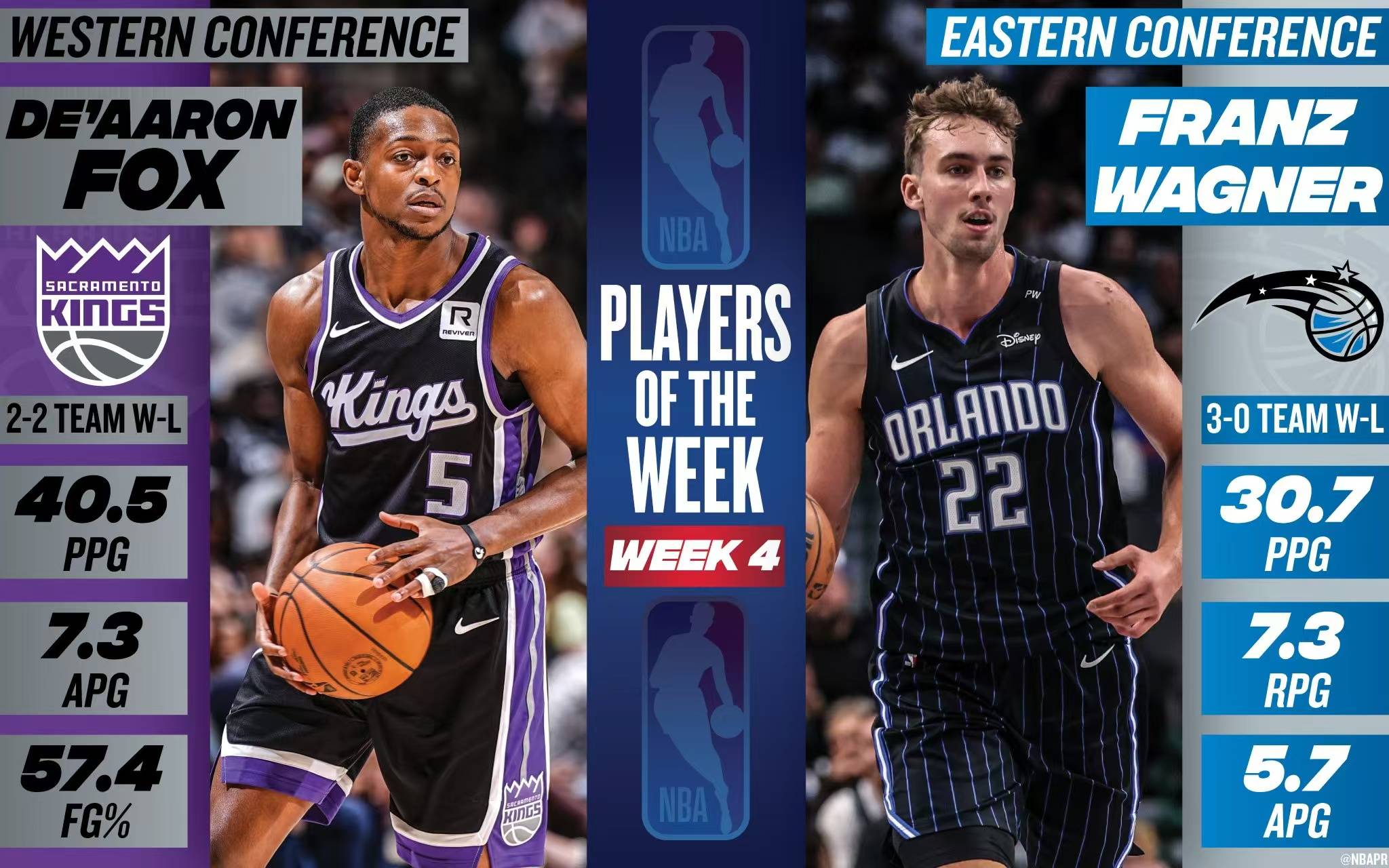北京时间11月19日消息,NBA官方宣布,魔术队的弗朗茨-瓦格纳和国王队的达龙-福克斯荣膺上周东西部最佳球员。
