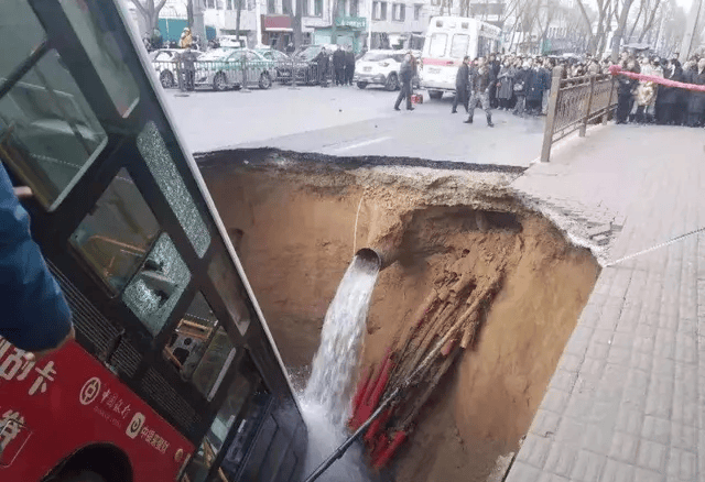 ▲ 挖断承重柱导致水管被砸断,大量水渗入路基引起的地面塌陷事故