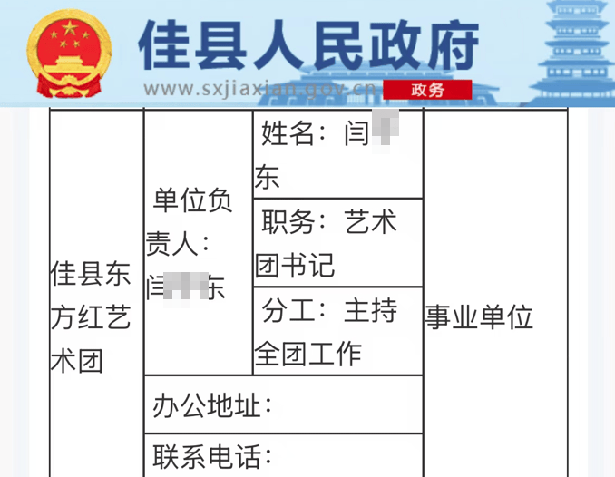 12月9日,奔流新闻记者从佳县政府官网了解到,佳县文旅局下属事业单位——佳县东方红艺术团的书记闫某某与被举报干部同名。