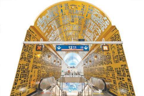 在3号线一期东四十条站车站看到,该站为上世纪五十年代早期规划的地铁换乘车站,为了与2号线风格统一,此次装修主题为“致敬经典·城市印记”,运用现代手法完成了与经典地铁2号线的“牵手”,在保留与更新中实现历史与现代的融合延续。