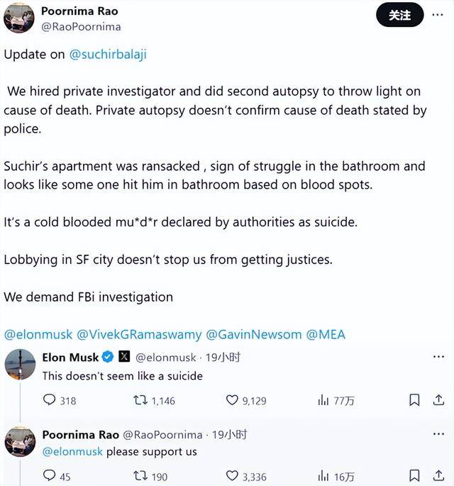 巴拉吉的母亲29日在社交平台X上发帖称,私家侦探进行第二次尸检的结果与警方认定的“自杀”结论不符,“事发公寓被洗劫一空,浴室里有打斗的痕迹。从血迹来看,似乎是有人在浴室里殴打了巴拉吉”。她还写道:“这是一起冷血的谋杀案,但被当局宣称是自杀。”为此,美国企业家伊隆·马斯克评论称:“这看起来不像是自杀”。