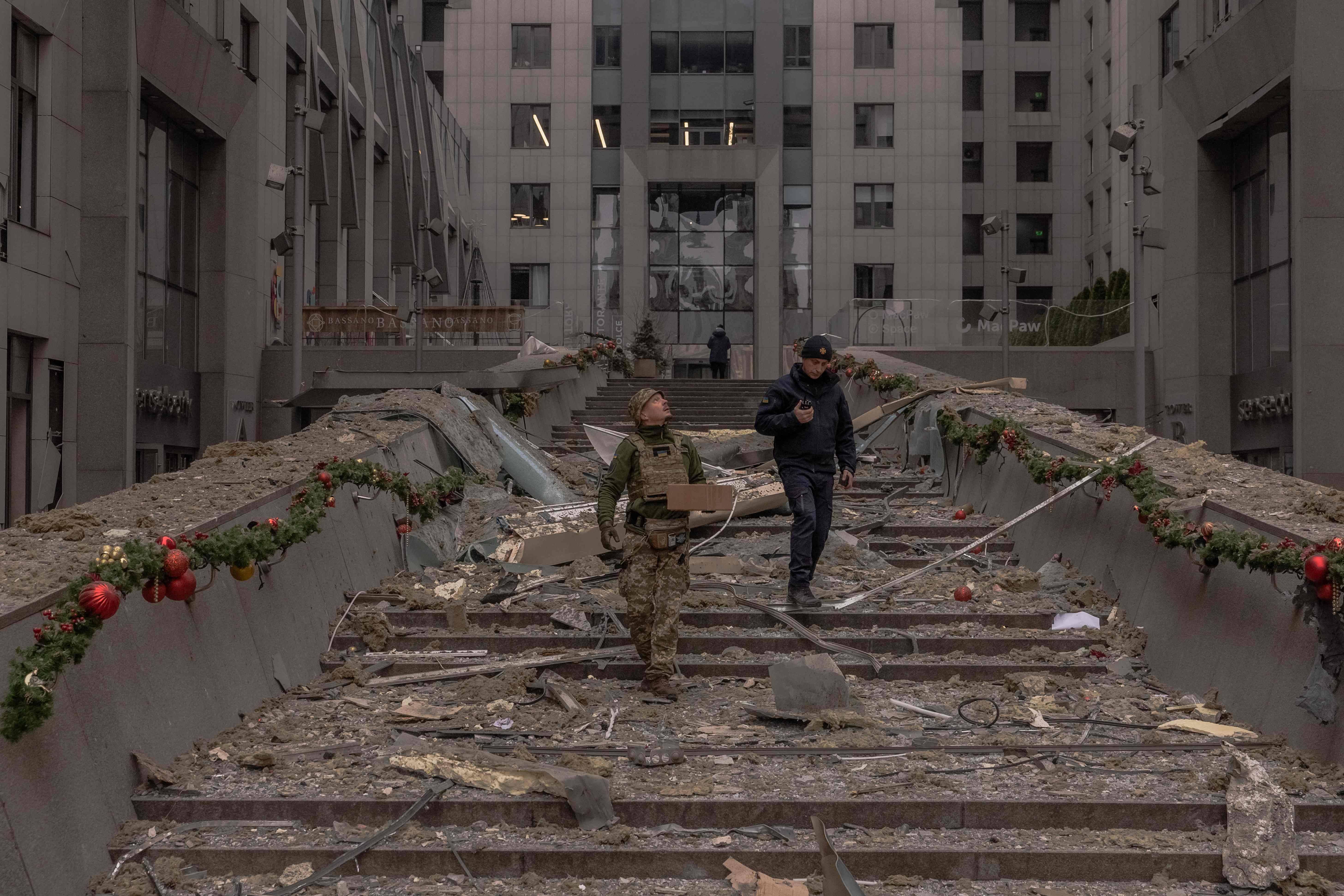 2024年12月20日,乌克兰执法人员在基辅检查俄导弹袭击后一栋建筑的受损情况。(法新社)