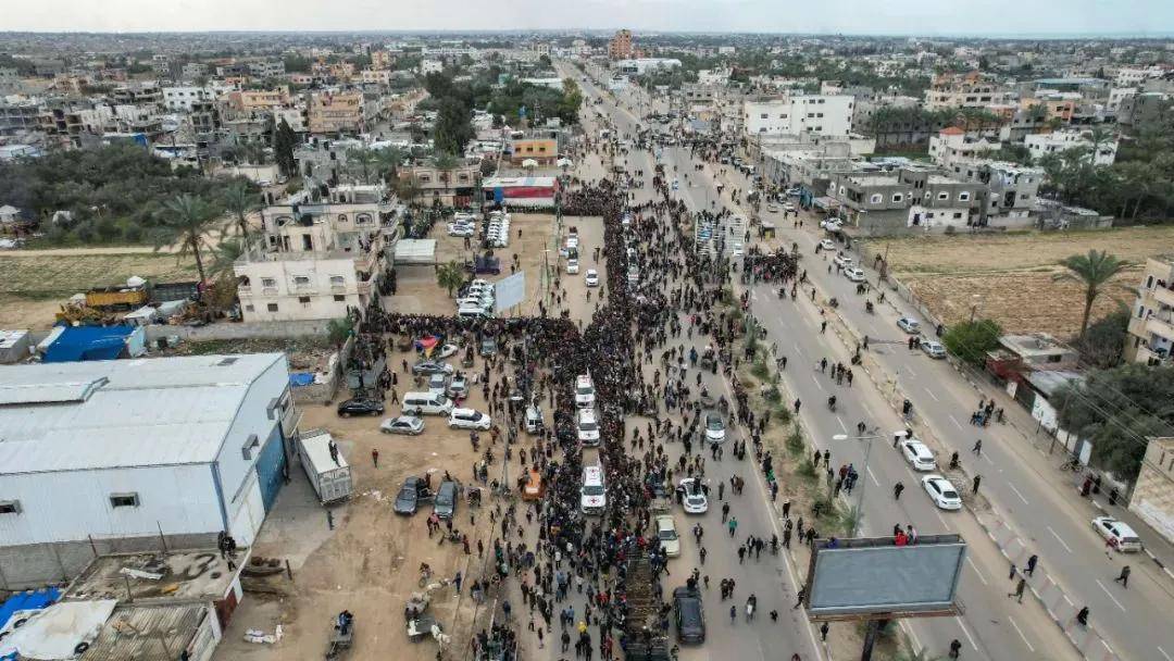 这是2月8日在加沙地带中部代尔拜拉赫拍摄的被释放的第五批被扣押以色列人员移交现场(无人机照片)。新华社发(里泽克·阿卜杜勒贾瓦德 摄)