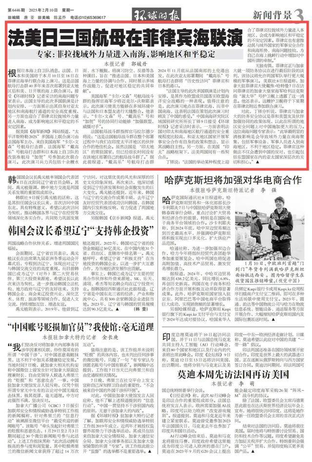 根据日本海上自卫队消息,法国、日本和美国将于本月10日至18日在菲律宾海举行联合海上演习,这是法国航母打击群40多年来首次部署到亚太地区后和美、日开展的海上联合演习。接受《环球时报》记者采访的南海问题专家表示,法国主导的此次多国联演是计划内安排,一方面展示出其自身对亚太地区和南海航行通道的安全高度重视,另一方面也迎合了菲律宾拉拢域外力量进入南海,成为影响地区和平稳定的不安定因素。