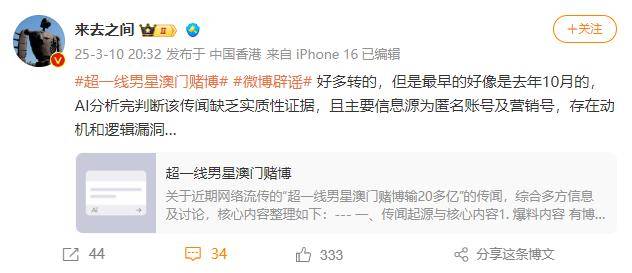 据潇湘晨报,3月10日晚,微博首席执行官王高飞@来去之间 发文回应网传“超一线男星澳门赌博”称:“最早的好像是去年10月的,AI分析完判断该传闻缺乏实质性证据,且主要信息源为匿名账号及营销号,存在动机和逻辑漏洞……”