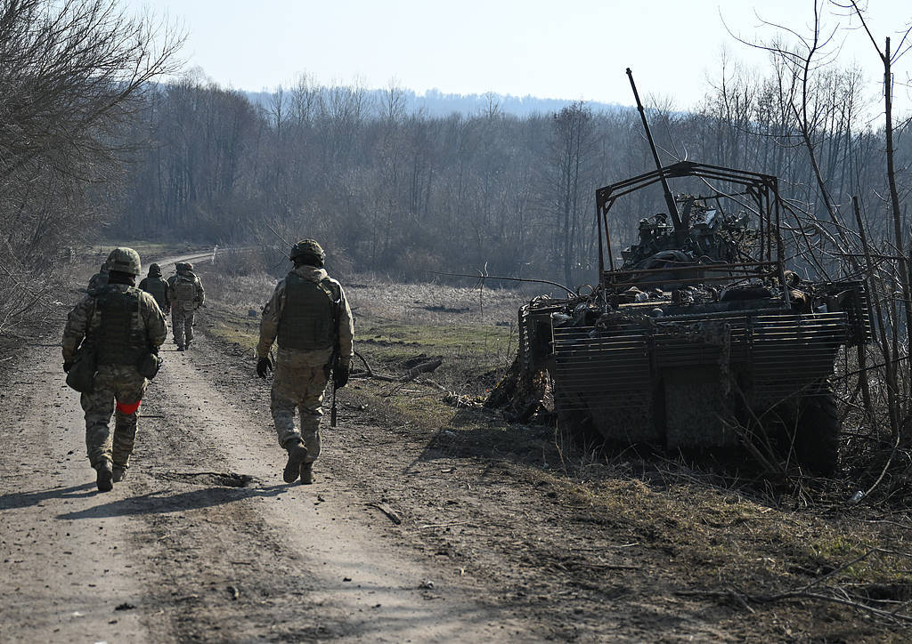 当地时间2025年3月9日,俄罗斯库尔斯克州,俄军“北部”集群部队士兵在波格列布基村巡逻。视觉中国 图