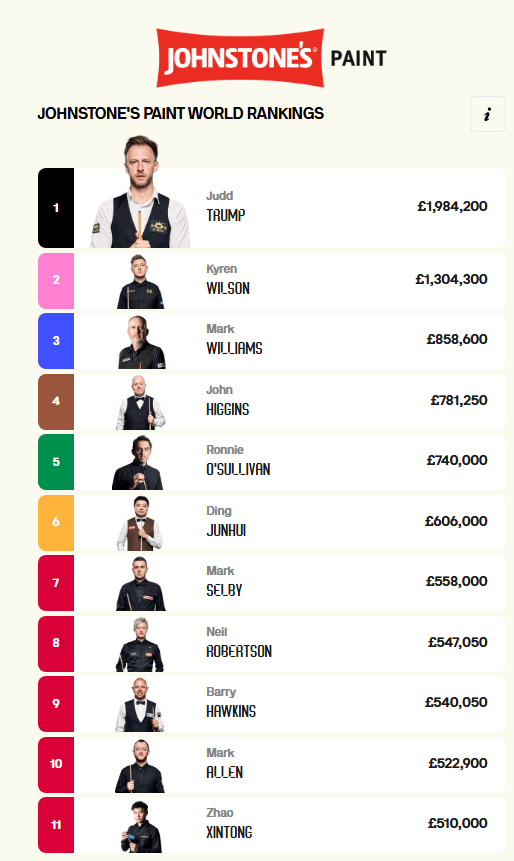 在最新的世界排名中,特鲁姆普位居榜首,凯伦-威尔逊紧随其后,“75三杰”马克-威廉姆斯、希金斯、奥沙利文分列三、四、五位,丁俊晖排在第六位。