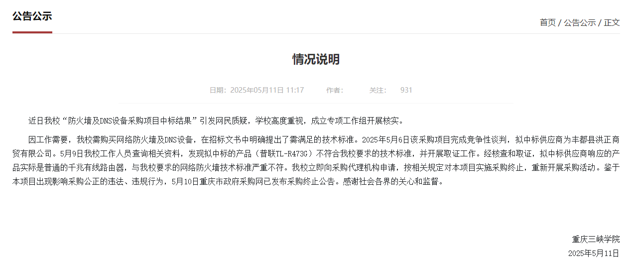 针对此事,重庆三峡学院5月11日发布一则情况说明称,近日该校“防火墙及DNS设备采购项目中标结果”引发网民质疑,学校高度重视,成立专项工作组开展核实。