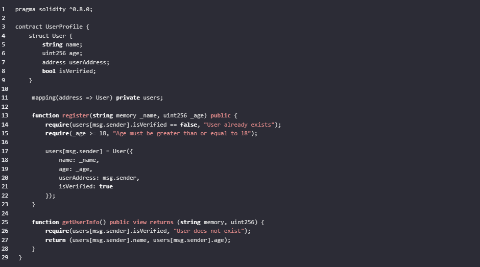 智能合约是区块链应用的核心,它自动执行合约条款,无需第三方介入。以下是一个简单的智能合约示例,用于实现用户注册和基本信息验证: