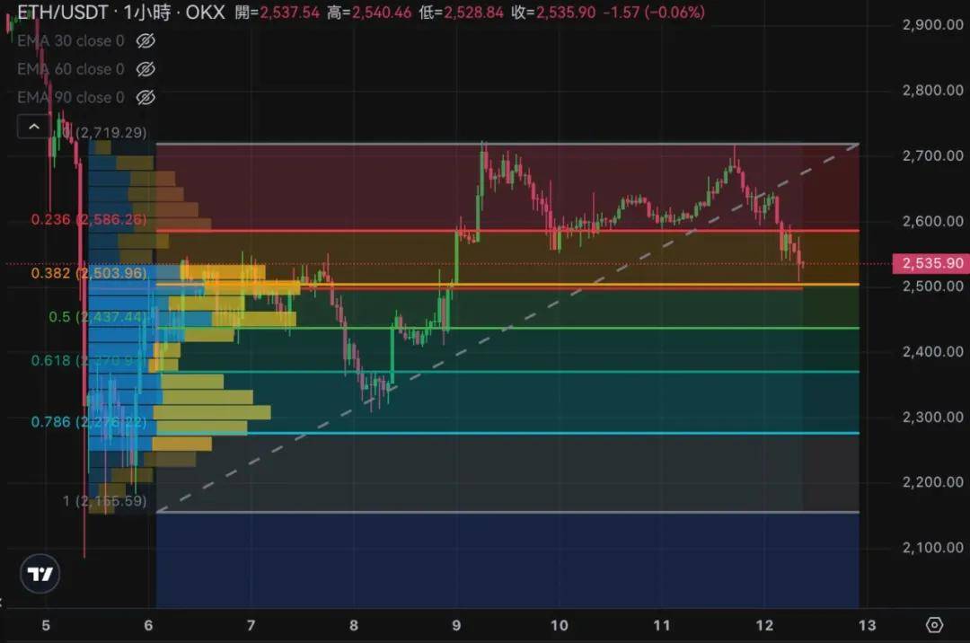 目前来看2500美元是一个成交密集区,如果失守的话,接下来可能会去挑战2400美元的前低。