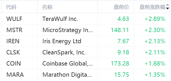 加密货币概念股普涨,截至发稿 TeraWulf Inc. 涨近3%, MicroStrategy Incorporated 、 Iris Energy Ltd 、 CleanSpark, Inc. 涨超2%, Coinbase Global, Inc. 涨近2%: