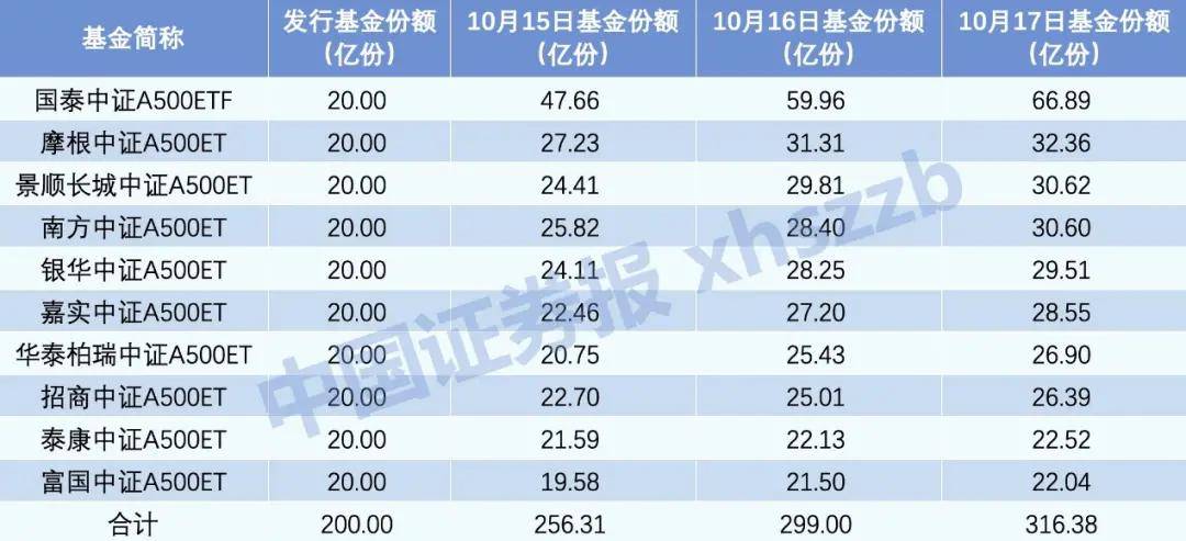 10月15日,10只中证A500ETF集体上市,此后基金规模持续扩张,截至10月17日,10只中证A500ETF总规模已由上市之初的200亿份大幅增至310亿份以上;