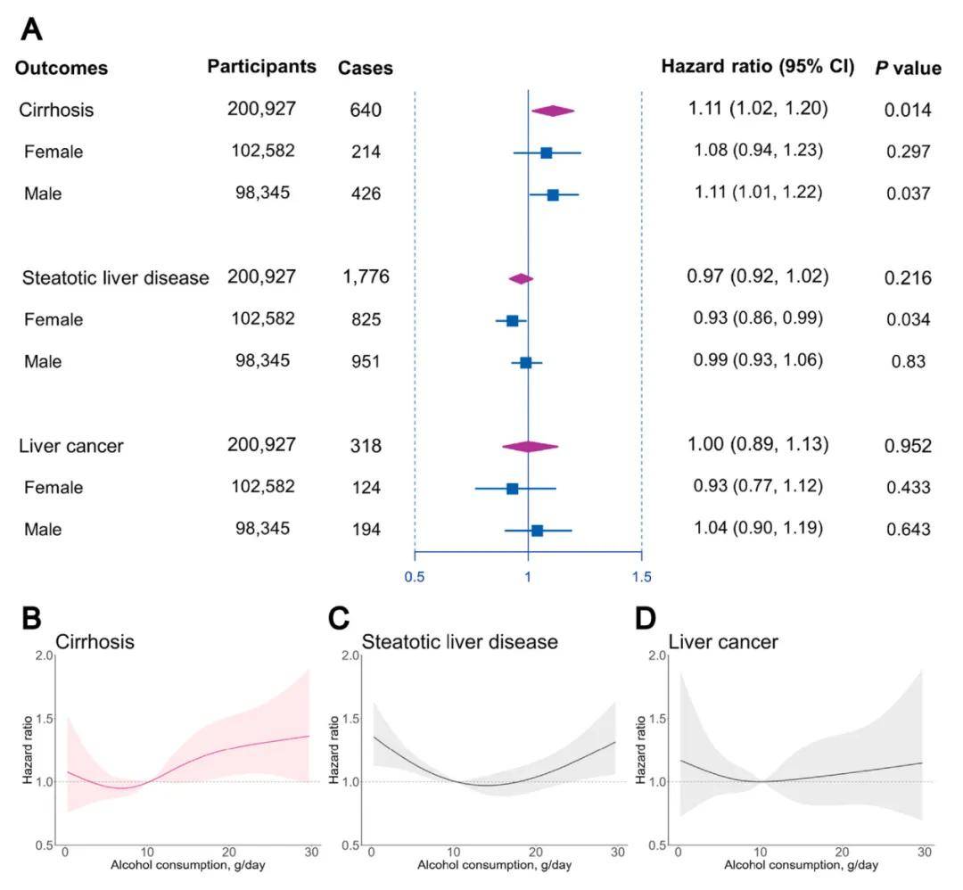 在12.7年的中位随访期间,共记录了705例肝硬化、2020例肝纤维化和350例肝癌病例。与不喝酒的人相比,适量饮酒者的脂肪性肝病(SLD)风险较低(HR=0.77)。在适量饮酒者中,葡萄酒(Wine)摄入量与发生肝硬化的风险增加有关(HR=1.11),但将酒精摄入量限制在每天不超过16克后,这种关联减弱。饮酒量与发生肝硬化和脂肪性肝病的风险呈负关联(HR分别为0.82和0.91)。适量饮酒与SLD之间的负相关性可能存在性别依赖关联。