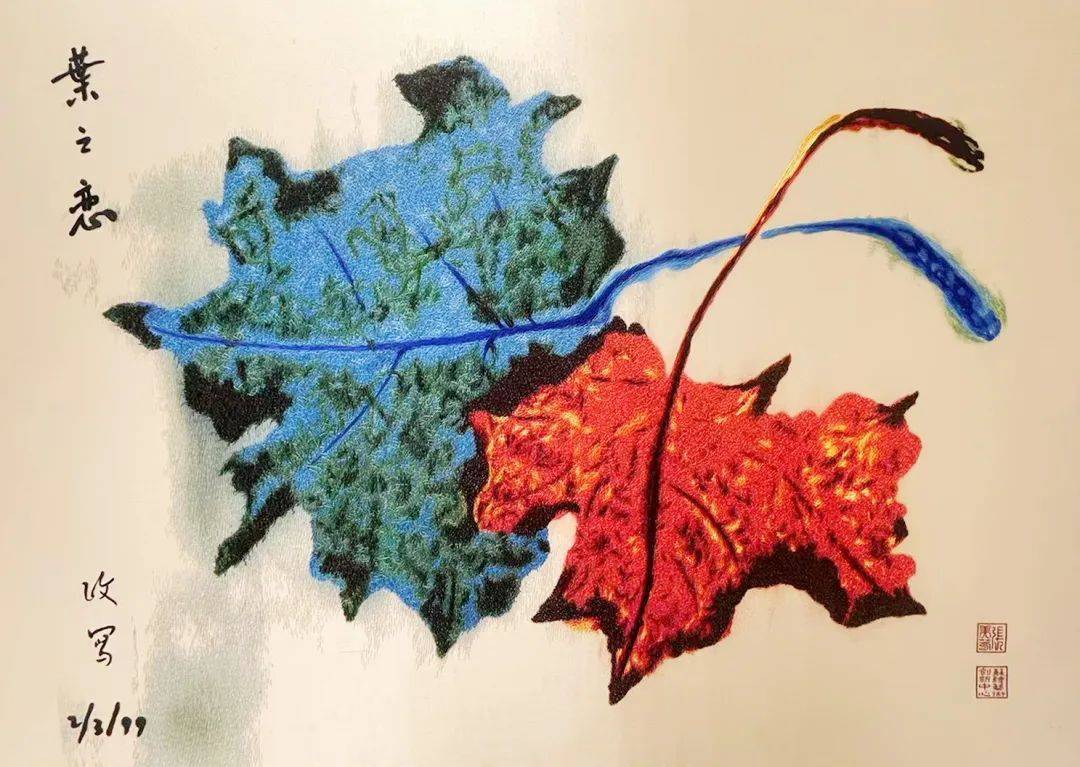 另一幅名为《叶之恋》的作品,以李政道的画作为蓝本创作。画面上,红蓝两片树叶紧紧依偎,灵动飘逸,仿佛在随风轻舞。“蓝色的叶子代表李政道先生自己,红色的叶子代表夫人秦惠䇹。”张美芳儿子、苏绣艺术创新中心主任张帆介绍。