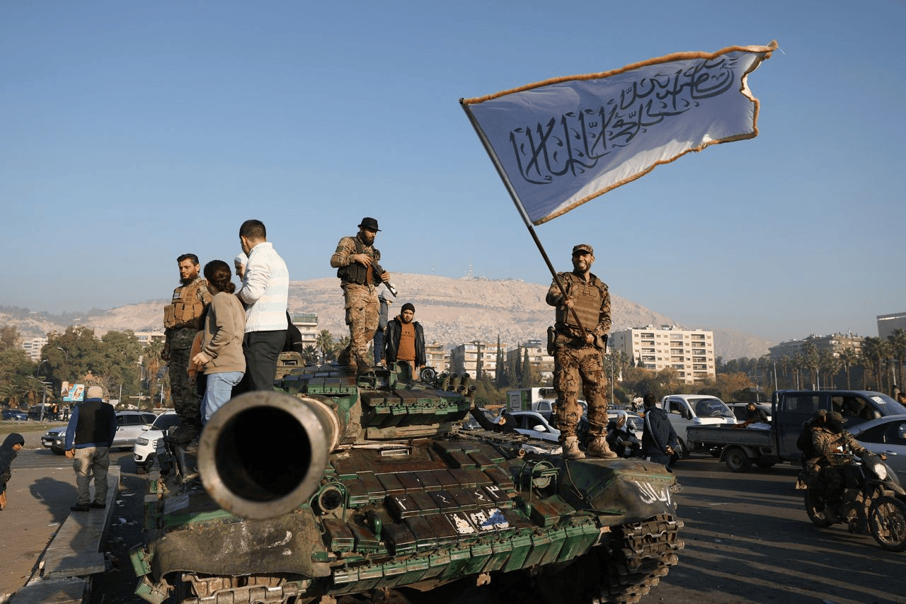 12月9日,一名反对派士兵在大马士革的一辆坦克上挥舞着伊斯兰旗帜
