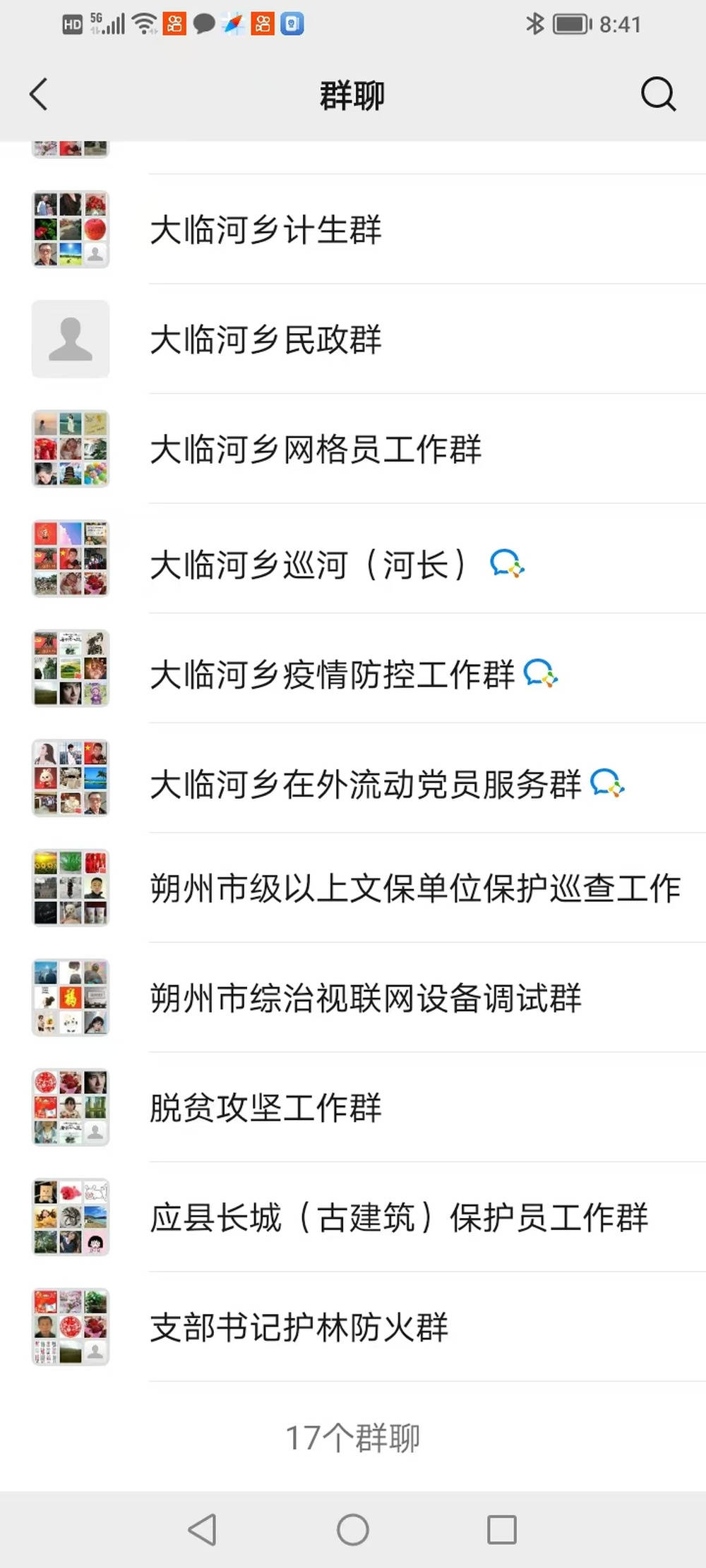 冯女士提供方某日常工作群显示,涉及法律服务群、网格员工作群、巡河(河长)群、护林防火群、在外流动党员服务群等十多个群,“这是我父亲的日常工作群,全部都是和乡里在对接。”