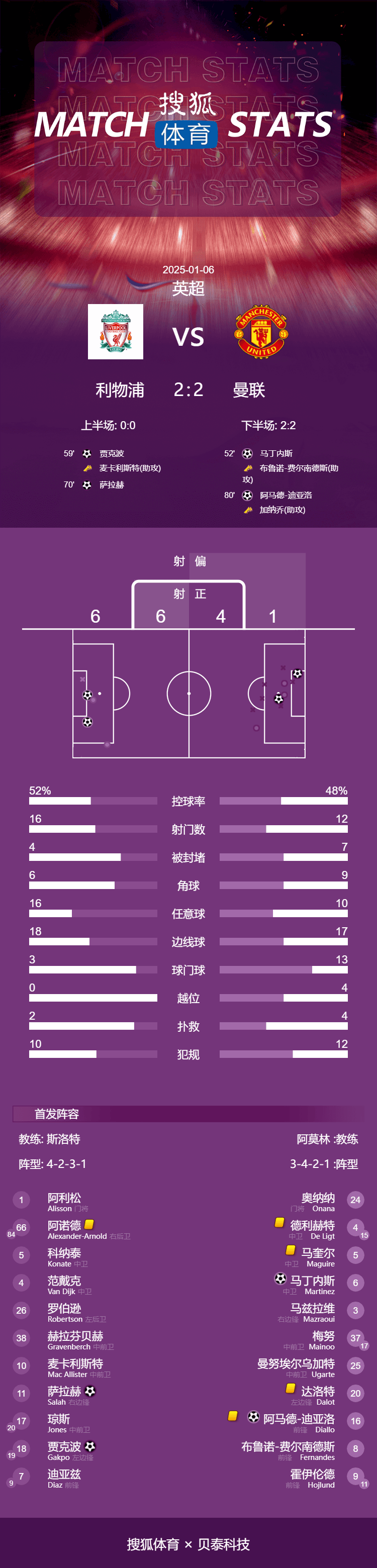 北京时间1月6日00:30,2024-25赛季英超联赛第20轮焦点战打响,坐镇安菲尔德球场的利物浦2-2战平曼联,正赛四连胜被终结,但连续24场不败,在英超积分榜上少赛一场的情况下6分优势领跑。利桑德罗-马丁内斯第52分钟爆射助曼联先拔头筹,加克波和萨拉赫随后连入两球助利物浦反超,阿玛德第80分钟扳平比分,助曼联结束四连败。