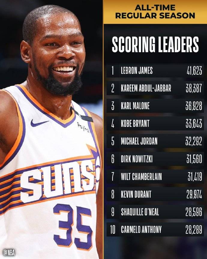 杜兰特两罚全中生涯得分突破三万大关 历史第八人