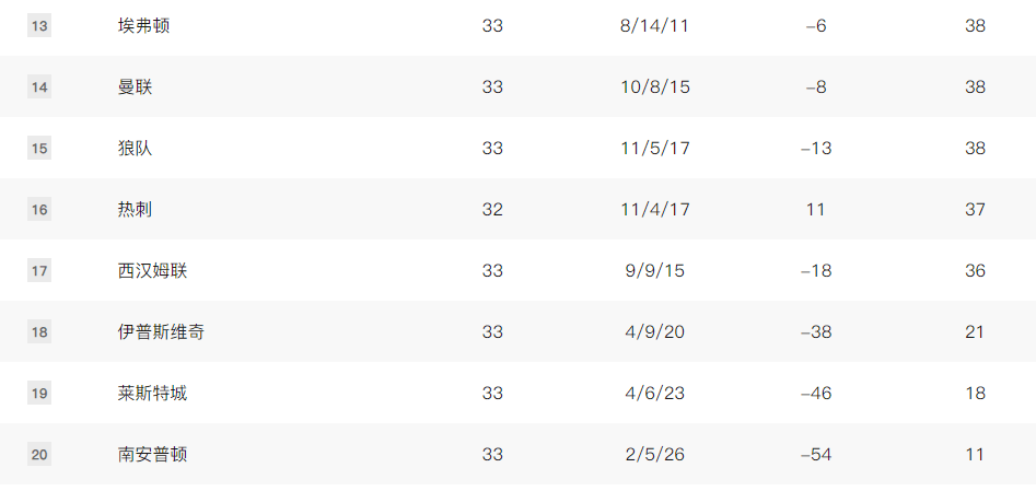 北京时间4月20日21点,2024/2025赛季英超联赛第33轮继续进行,“红魔”曼联坐镇主场老特拉福德球场迎战狼队。比赛中两队在上半场都无所作为,下半场萨拉维亚直接任意球破门,芒特连续错失得分机会,最终狼队客场1-0战胜曼联,实现了对阵“红魔”的赛季双杀,收获联赛五连胜,曼联则是四轮不胜。此役过后,曼联与狼队同积38分,分别排在第14和第15位,在联赛还剩5轮的情况下,领先排在第18位的伊普斯维奇17分,携手保级成功。
