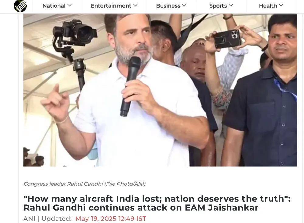 从ANI的报道来看,拉胡尔曾于5月17日对印度外长苏杰生提出过这个问题,要求苏杰生给出印度在与巴基斯坦的冲突中损失的战机的具体情况。